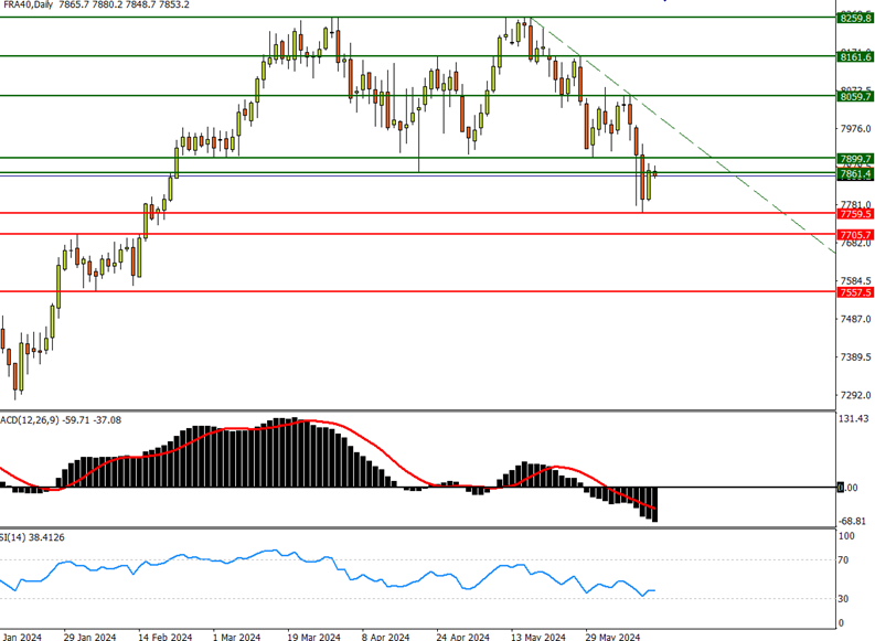目前看,法指的下行趋势线明显,也是一波比一波低的形态,关键的前低支持点在7860水平也已跌破,假如短期内没法收复7900水平,以及维持下降趋势线。下方将挑战7760、7560水平。