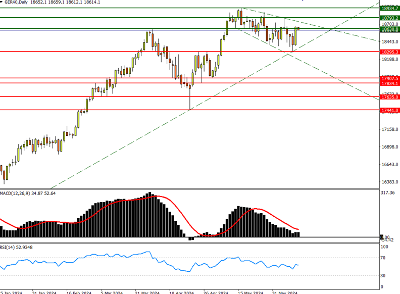 德指方面,自去年10月底至今的上涨趋势线仍然维持,最新在18930水平遇阻回落,并形成了下行通道,也形成了一波低于一浪形势。不过,由于大方向上的上涨趋势仍在,下方关键支持在18295水平,假如能守住该支持,并维持上涨趋势线,进一步突破18790水平,便有望突破了下降通道。