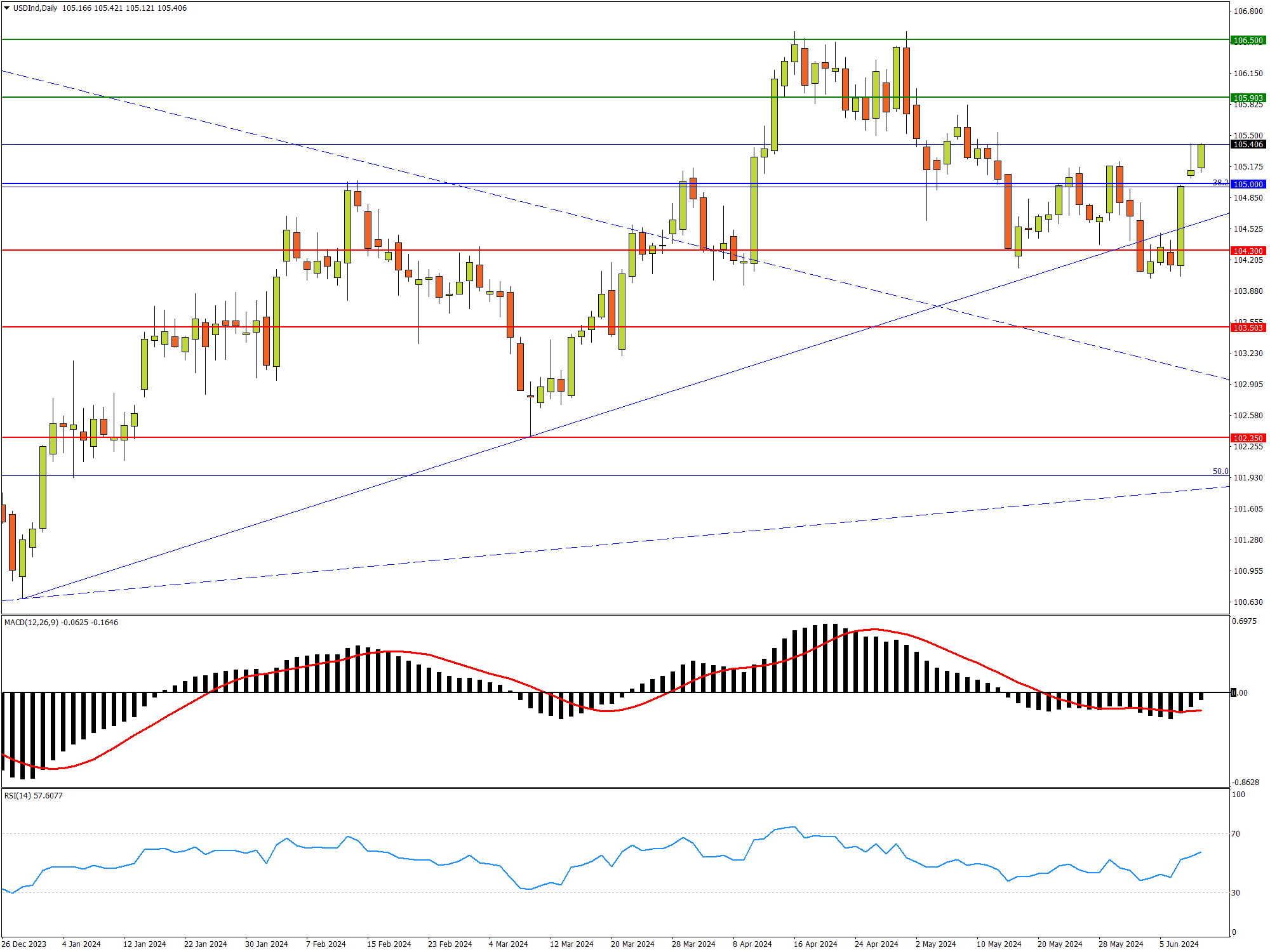 更多阻力可依次参考去年上半年高点105.90,4月小双顶高位区106.50,以及去年峰值107.35。