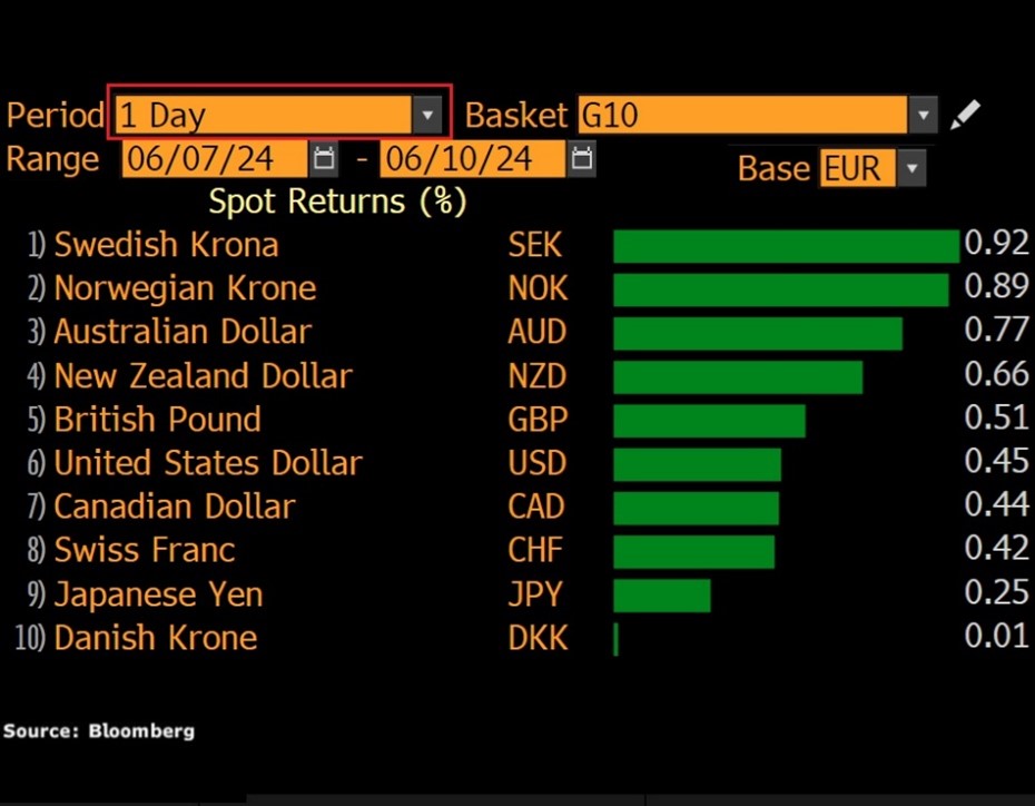 上周末,法国欧洲议会议员选举的初步结果显示执政党阵营惨败给极右翼政党。马克龙随后宣布解散议会,并呼吁在本月底之前举行提前选举。极右翼政党力量壮大令人们担心今后议会通过新的立法将变得更加困难。对于市场而言,欧洲政治前景的不确定性可能继续鼓舞欧元空头发力。
