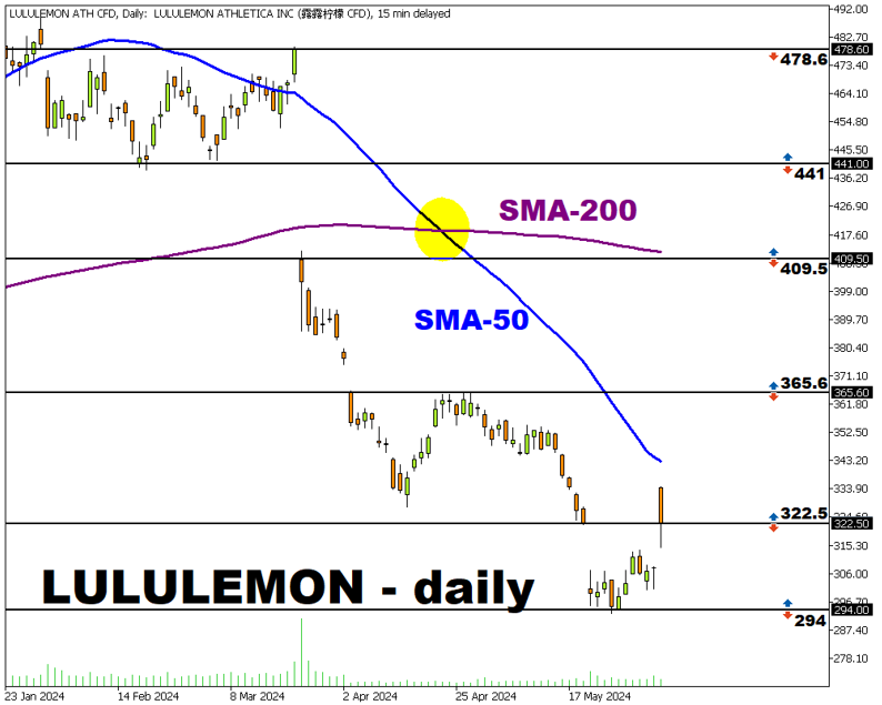 加拿大运动服装品牌露露柠檬(Lululemon)发布了2024财年第一季度财务业绩(截至2024年4月28日)和指引,推动股价录得 去年10月以来的最大涨幅。