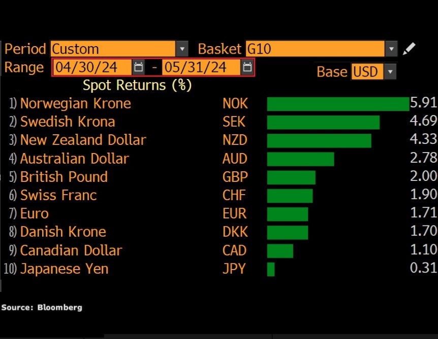 值得注意的是,5月份美元兑G10货币全线走软。