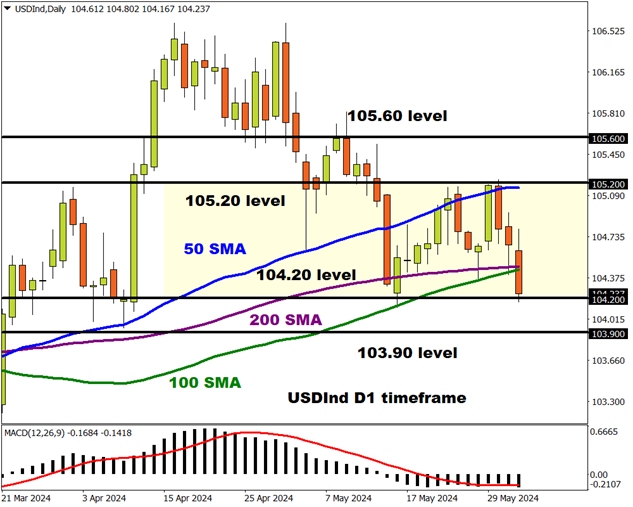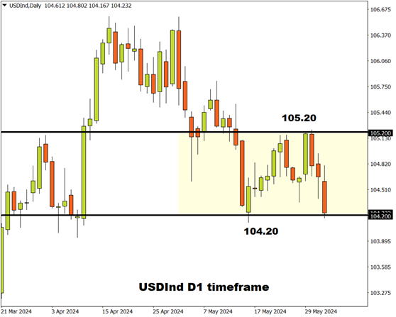 日线图上,美元指数保持区间波动,支撑位和阻力位分别在104.20 和 105.20。