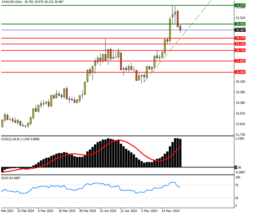 但如跌破29.78水平,下方關鍵支持在29.30水平,也是前低點,如跌破前低點或將形成新的下跌趨勢。