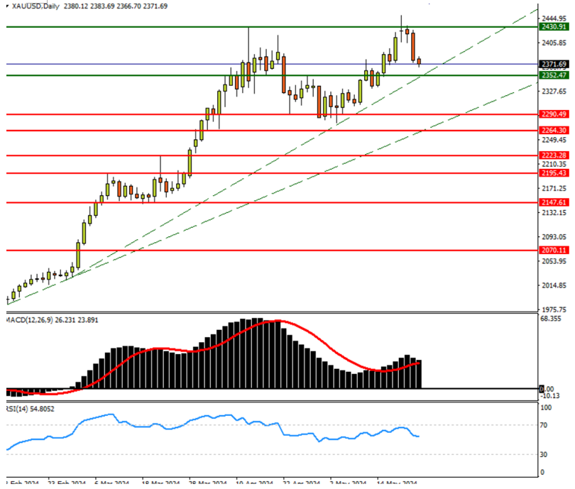 整體形勢上金價在日線圖仍在上漲趨勢線之上,不過,要注意的是本周金價再創歷史高點至2450水平,當天收了十字星並沖高回落,其後連跌兩天,目前即將測試下方2350水平。