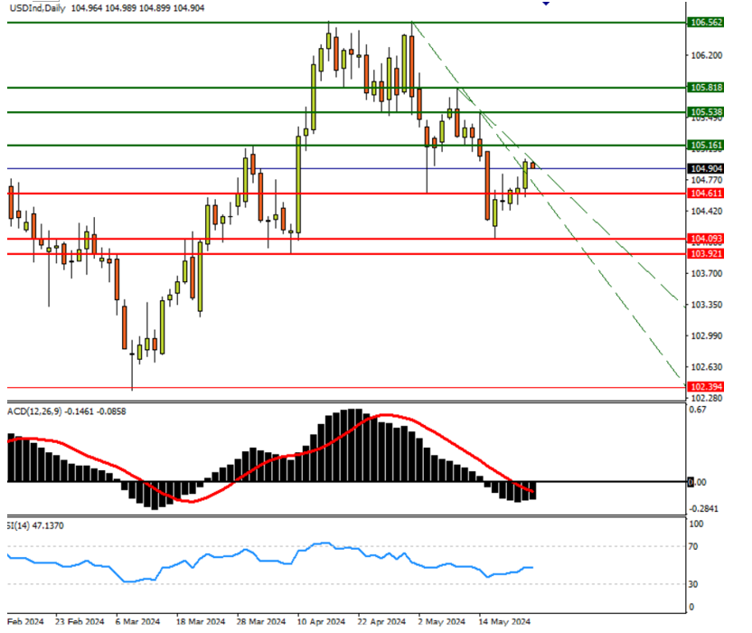 假如市場憧憬6月更新的點陣圖會降息兩次,而最終未能符合預期共識,美元指數或會進一步向上突破。