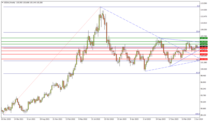 点位来看,21年1月-22年9月升势的38.2%回撤位105.00,去年12月高点104.30都是重要支撑节点。随后过去两年来多次形成中继转折的103.50也有阻跌效力。