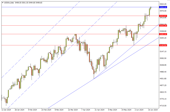 标普500和纳指不断走出上升推动浪,前者步入了4月中旬来短期升势的第五浪,需留意在4月调整行情的逆向1.618倍映射位5500一线的潜在阻力。