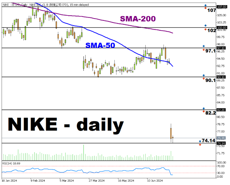 从技术面看,技术图表显示耐克走势一浪低过一浪,特别是在业绩公布后,该股开盘向下跳空,从93.6跌至74.2(-20%),触及2020年3月以来的最低水平。