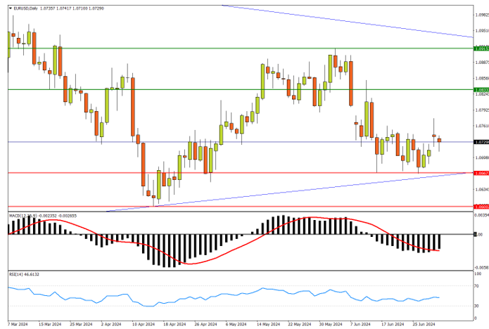 欧元同样在选举后冲高回落,但已略微远离1.0667的近期低位。而且连接去年低点与4月低点的支撑线与前者交汇,打造有力支撑。