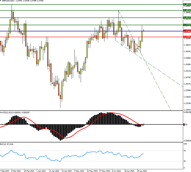 下方支持在1.2738、1.2706水平,只要不跌破1.2706水平,楔形反转形态将有望延续。