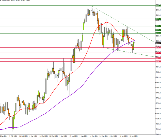 技术上,富时100指数自5月15日触及8480水平后开始回落,更形成了一浪比一浪低的形势,20天均线更有跌破60天均线迹象,形成下跌趋势。假如一浪比一浪低形态延续,下方跌破8100水平将有进一步回落可能,支持参考8060、8030水平。上方阻力在8263、8289水平。